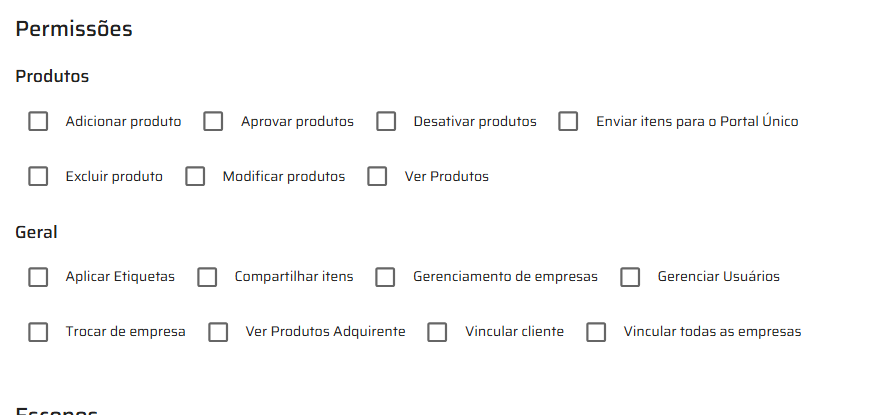 Colaborador: possui "Ver Produtos"; "Modificar Produtos" e "Adicionar Produto" habilitado automaticamente.