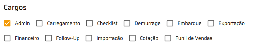 Note que possuímos 2 tipos de permissões referente os fluxos de Importação, Exportação e Cotação: Acessar e Administrador.