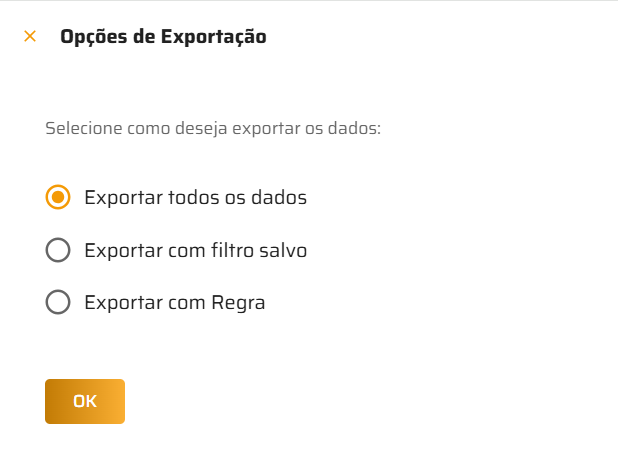 Caso não deseje exportar todos os dados, basta aplicar um filtro ou regra previamente criado, selecionando a segunda e terceira opção, respectivamente.