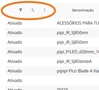 Para ordenar as informações da coluna, clique em . Assim, as informações são ordenadas em forma crescente/decrescente ou alfabética/alfabética decrescente.