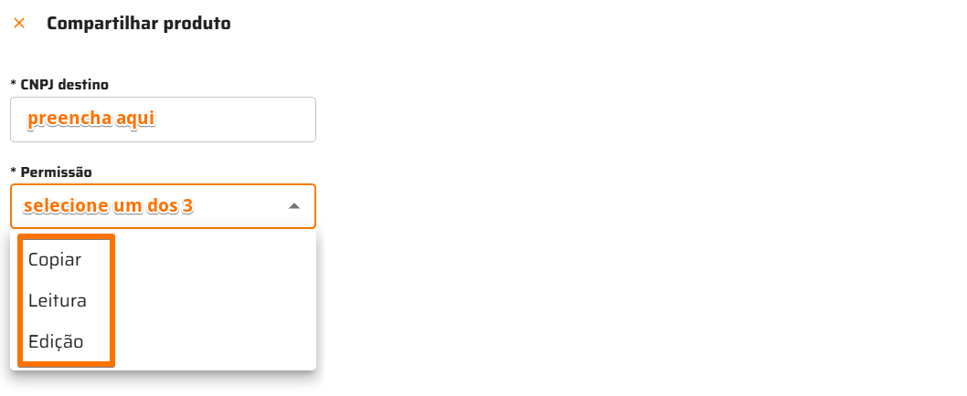Preencha o CNPJ de destino, para a qual os produtos serão compartilhados, e qual permissão a empresa receberá: Copiar, Leitura ou Edição.
