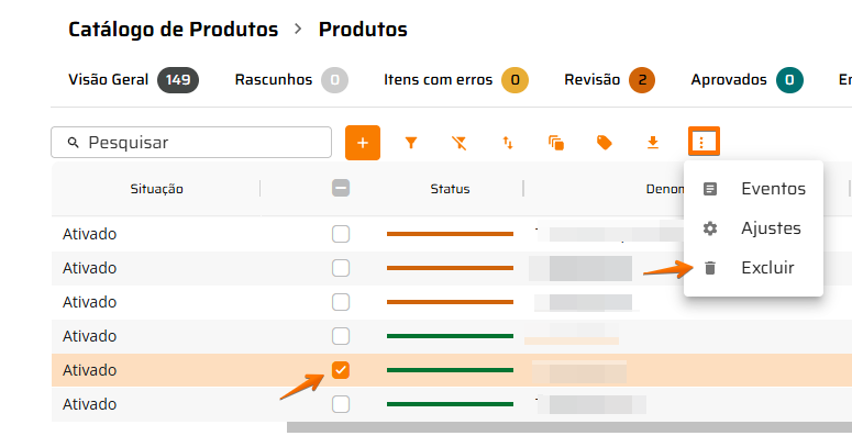 Para isso selecione o produto e depois a opção excluir, conforme a imagem: