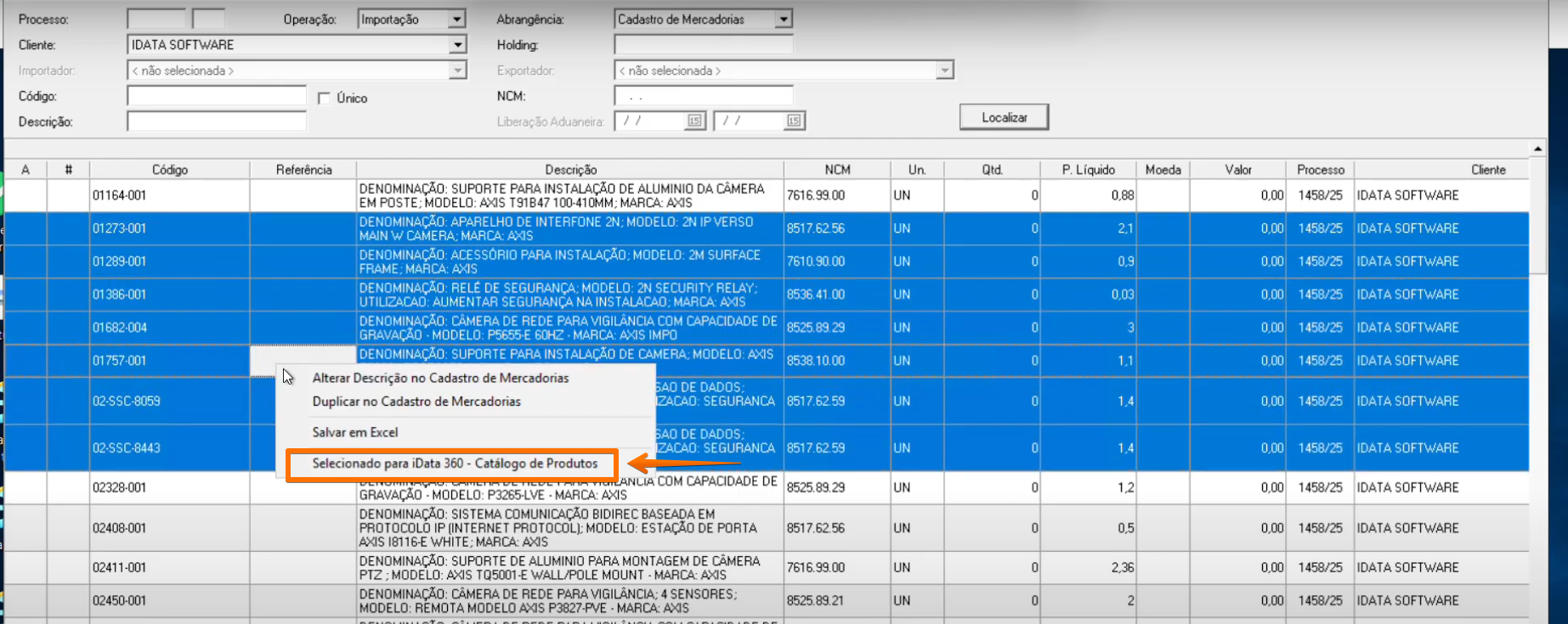 - Com o(s) produto(s) selecionado(s), clique com o botão direito do mouse e em Selecionar para iData 360 - Catálogo de Produtos.