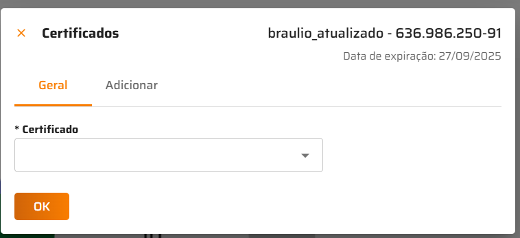 - O certificado em uso da empresa, se houver, será exibido em tela, com a respectiva data de expiração do certificado.
