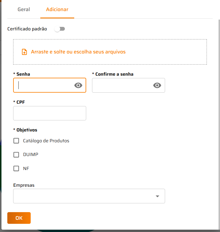 - Adicione o arquivo do certificado e defina em que empresas serão vinculadas este certificado. Caso queira usar o Certificado como padrão, à todos os clientes, não preencha e empresa e habilite a opção de Certificado Padrão.