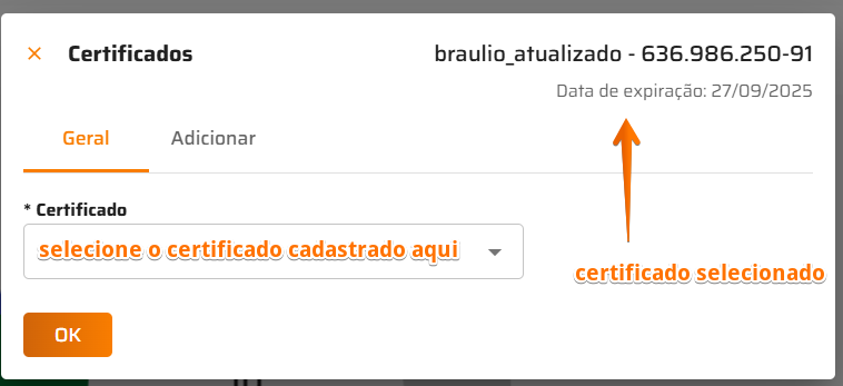 - Selecione o certificado que deseja utilizar nesta empresa ( o certificado deve ser cadastrado e vinculado a empresa anteriormente para aparecer aqui).