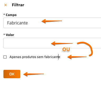 Clique em e selecione se deseja filtrar produto por adquirente ou fabricante e que valor deseja filtrar neste campo.